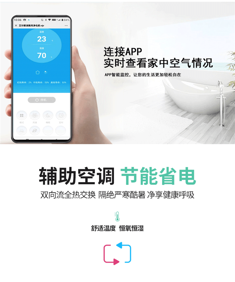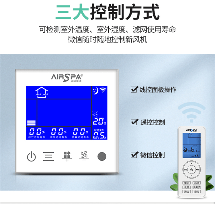 2、超大液晶顯示:自動顯示功能模式、風(fēng)量大小、室內(nèi)溫度、濕度、空氣質(zhì)量、二氧化碳濃度、負離子。高貴、典雅